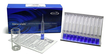 Ampollas de autollenado con reactivo para análisis colorimétrico instrumental de agua. Pueden utilizarse con fotómeros de Chemetrics o con cualquier espectofotómetro que acepte una celda redonda de 13 mm.